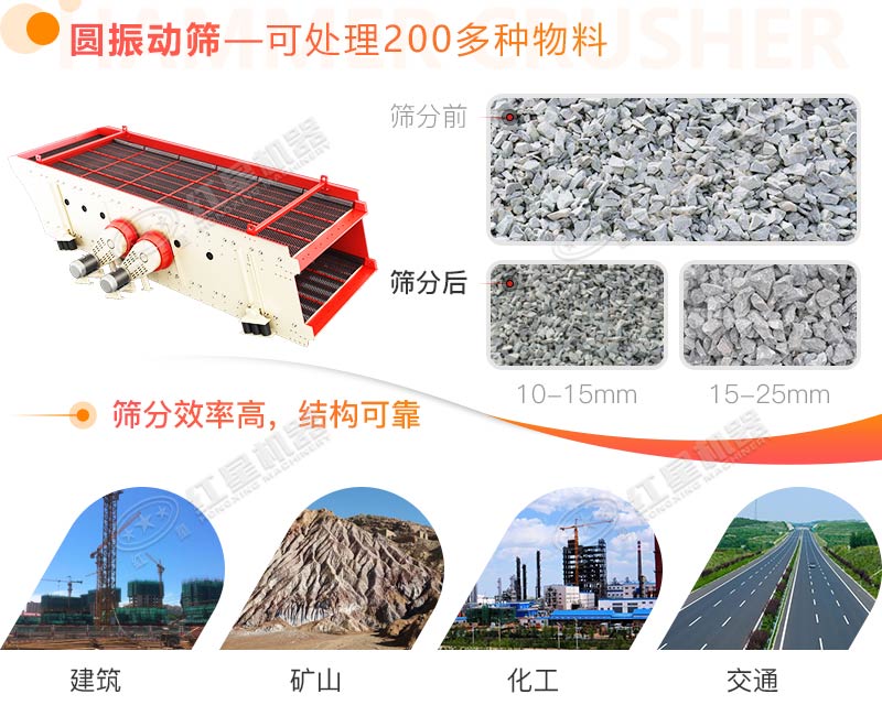 圓振動篩圓振動篩是一種做圓形振動、多層數(shù)、新型振動篩。圓振動篩采用筒體式偏心軸激振器及偏塊調(diào)節(jié)振幅,物料篩淌線長,篩分規(guī)格多,具有結(jié)構(gòu)可靠、激振力強、篩分效率高、振動噪音小、堅固耐用、維修方便、使用安全等特點,該振動篩廣泛應(yīng)用于礦山、建材、交通、能源、化工等行業(yè)的產(chǎn)品分級。