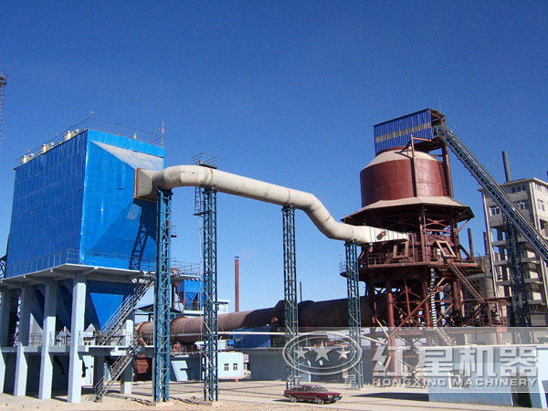 原礦從儲庫經電子皮帶計量秤、皮帶輸送機、穩(wěn)料倉、鎖風閥直接喂入回轉窯窯尾,窯尾只設穩(wěn)料倉,以減少投資。礦石進入回轉窯首先進行加熱,原礦在窯內和熱氣流逆向移動,在加熱區(qū)原礦被加熱到還原溫度后進入到還原區(qū)。還原區(qū)火焰中心溫度控制在1000℃左右,還原區(qū)熱氣氛溫度控制700℃左右與還原煤氣反應還原成磁鐵礦,之后進入冷卻帶,與進入的煤氣相遇,煤氣受到預熱,礦石被冷卻后排出窯外,經連續(xù)斗式輸送機水冷后,入儲庫待選。