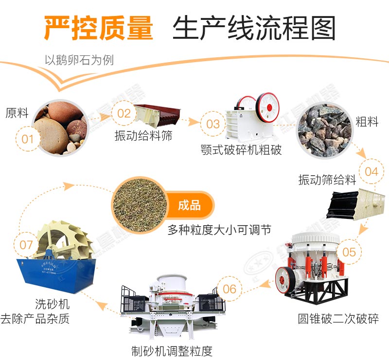 天然原石經(jīng)振動給料機(jī)送入顎式破碎機(jī)內(nèi)進(jìn)行初步的破碎,經(jīng)過振動篩篩選,合格部分繼續(xù)送入細(xì)碎機(jī)進(jìn)行打沙加工,對于粒度要求嚴(yán)格的生產(chǎn)線,可以接入振動篩,多重篩分能夠進(jìn)一步優(yōu)化成料品味,細(xì)化分級,成品砂料品味更好,級配更合理。